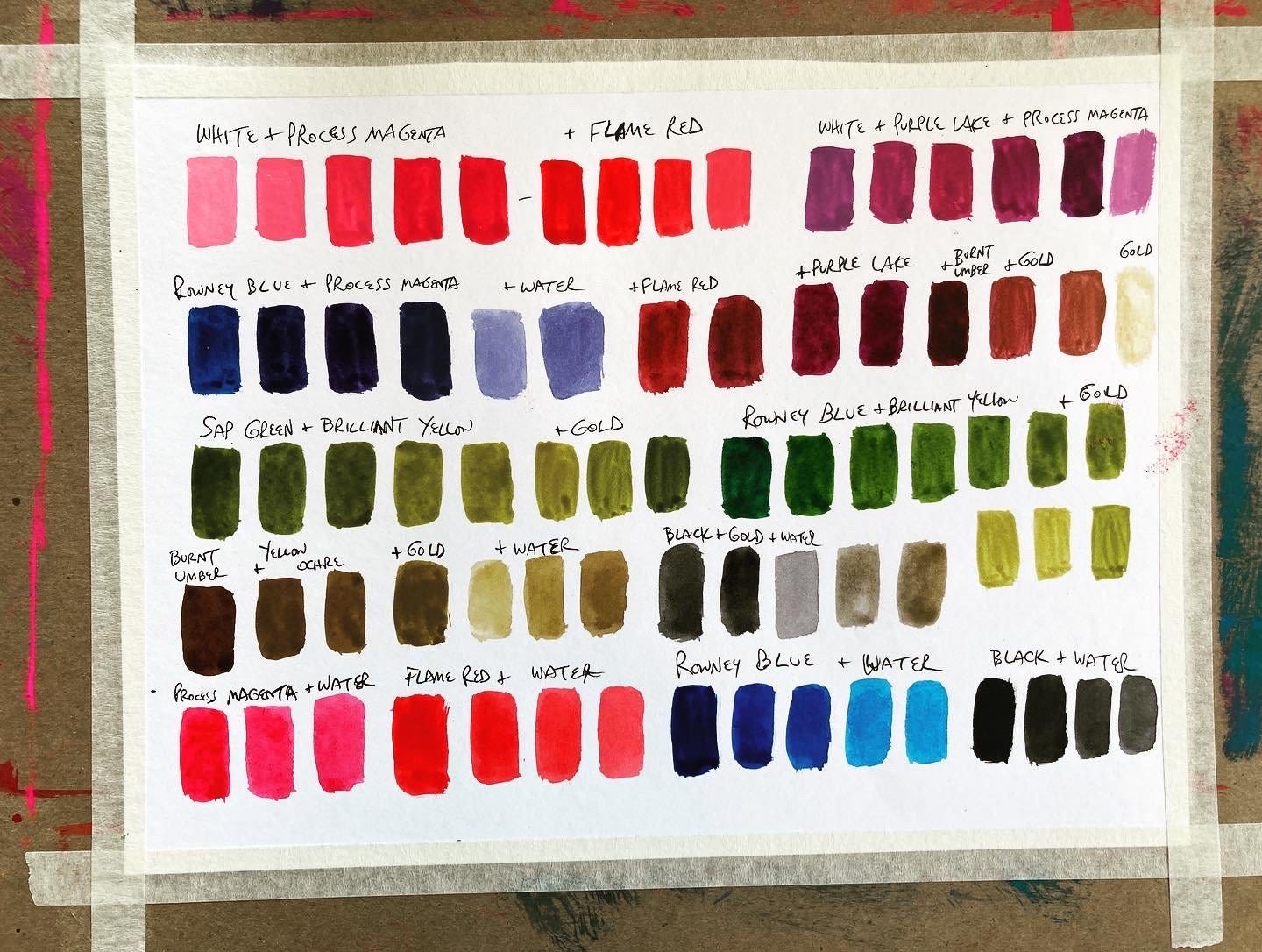 Often a group of pieces I painted around the same time have a similar style or energy. Sometimes it’s the color palette I’m painting with that is the similarity, sometimes it’s the tone. There’s a particular color or shape I want to play with, and sometimes it’s a challenge I give myself. It can be about a current event, or a spiritual lesson.